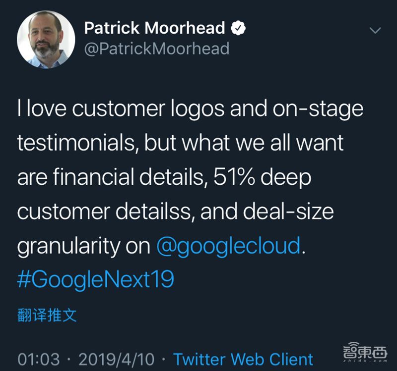 Moor Insights&Strategy总裁兼首席分析师Patrick Moorhead也直白地在推特上@谷歌云:“我喜欢客户徽标和现场推荐,但我们都想要的是财务细节、51%的深度客户细节以及交易规模。”